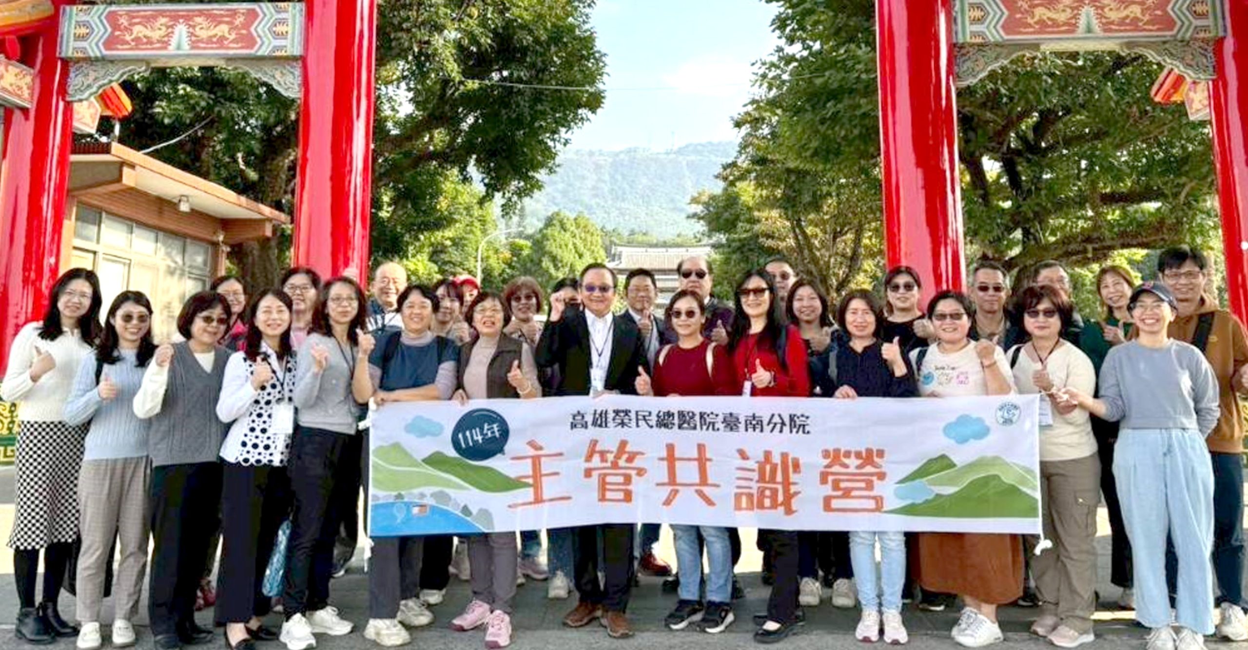 高雄榮總台南分院一一四年主管共識營走出戶外,利用週休假日前往關子嶺富野溫泉會館進行,以「醫者同心,服務創新」為主軸,邀請中山大學EMBA執行長蔡佳芬專題演講,引導學員思考行政管理與醫院營運策略,期望藉由課外互動凝聚各科部室共識。