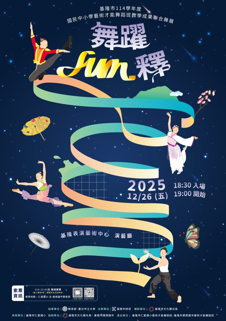 基隆市一一四學年度國民中小學藝術才能舞蹈班教學成果聯合舞展《舞躍Fun釋》,將於十二月二十六日晚間七時,在基隆表演藝術中心演藝廳隆重登場。