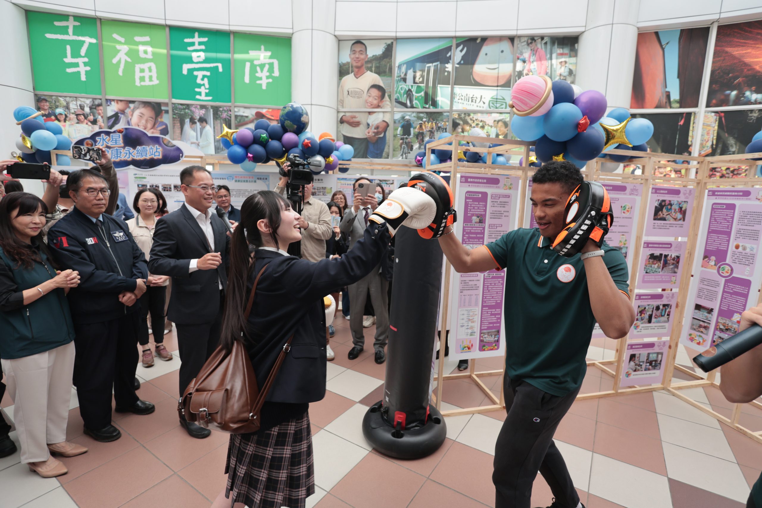 十五日開幕式中,來台修學旅行的日本山形城北高校師生受邀來訪,女高中生現場體驗肌耐力訓練,促進一場健康外交。