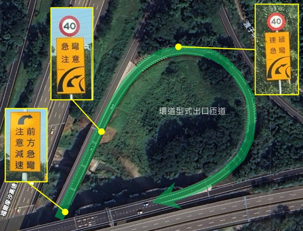 高公局表示,目前出口匝道環道彎道路段,已設置速限標誌、彎路標誌、安全方向導引標誌,並加密路面標記及於路肩劃設「白色斜紋線」。為進一步提升彎道行車安全,高公局針對曲率半徑較小之匝道環道路段,劃設視覺化減速標線,使駕駛人產生車道寬度縮減之錯覺,進而自然降速。自今年起,再針對環道型式之出口匝道,試辦「急彎」告示牌,以加強提醒用路人注意彎道及減速,以減少超速失控事故。