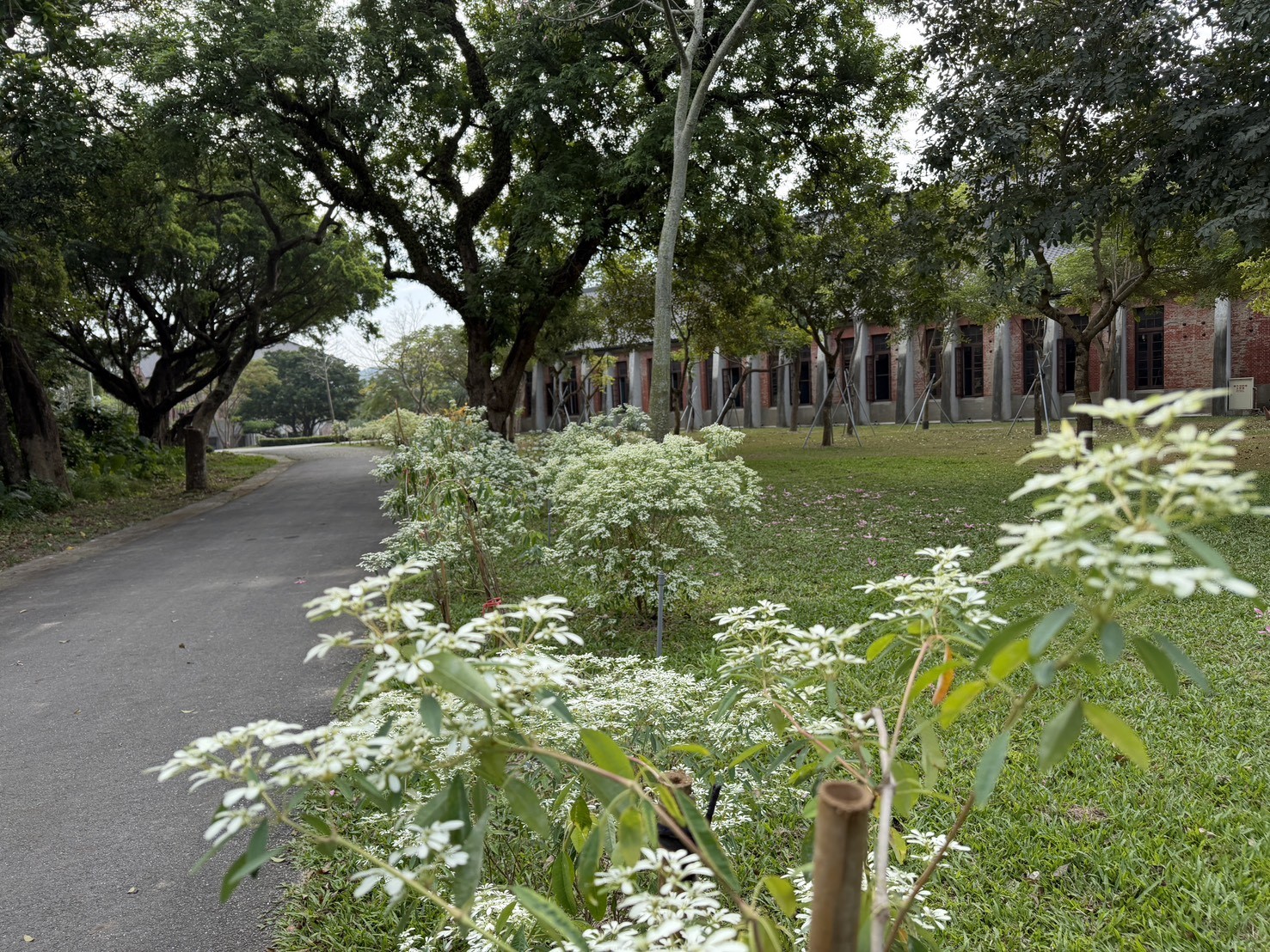 目前聖誕白雪沿著園區步道成片盛開,純白花海與後方百年紅磚建築相互映襯,展現典雅而浪漫的冬日景致,成為園區近期的賞花亮點。