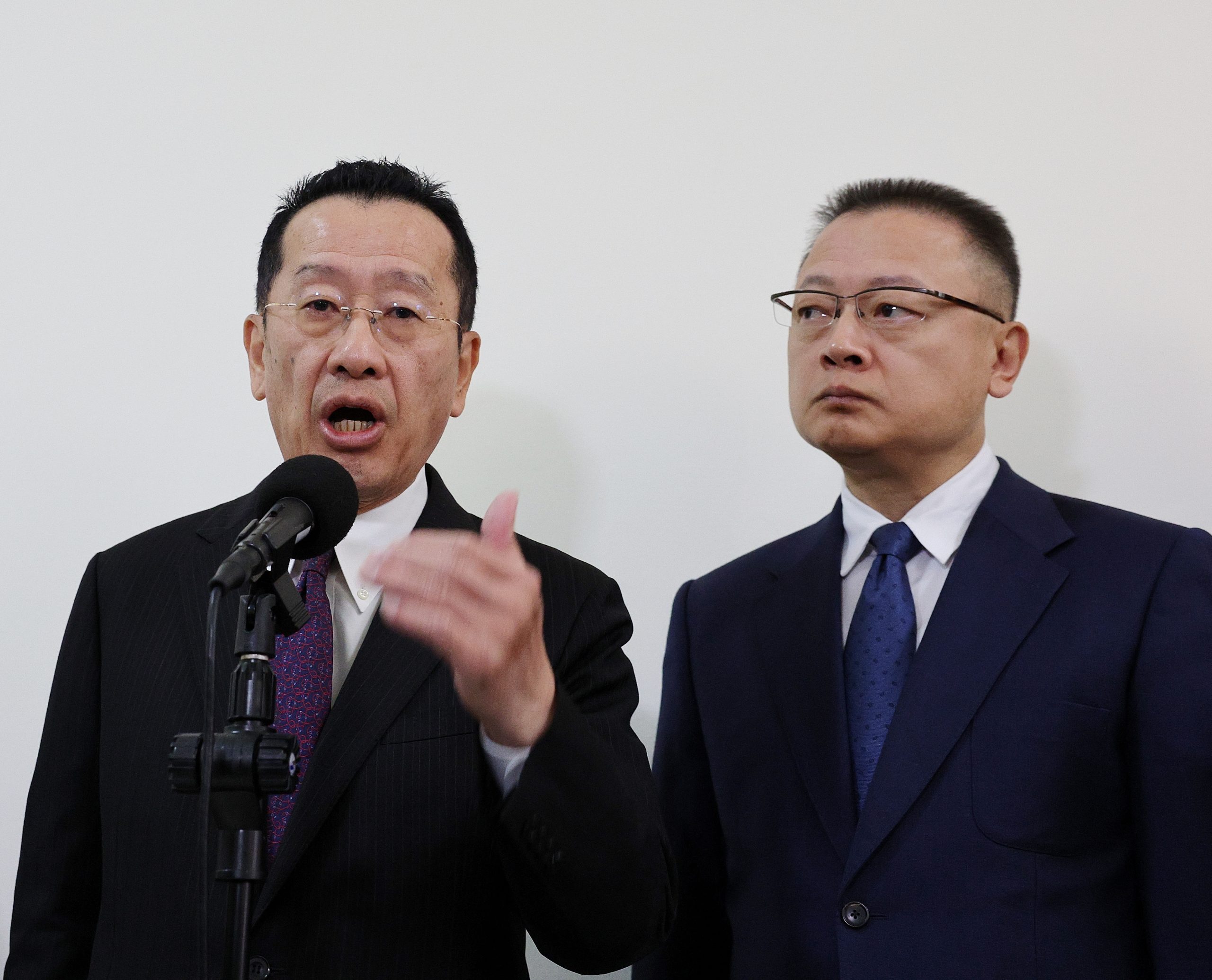 國防部5.9億餘元的火藥標案,得標廠商福麥的資格引發議論。國防部長顧立雄(左)15日上午受訪強調國防部絕對禁得起檢驗。右為國防部發言人孫立方。(中央社)