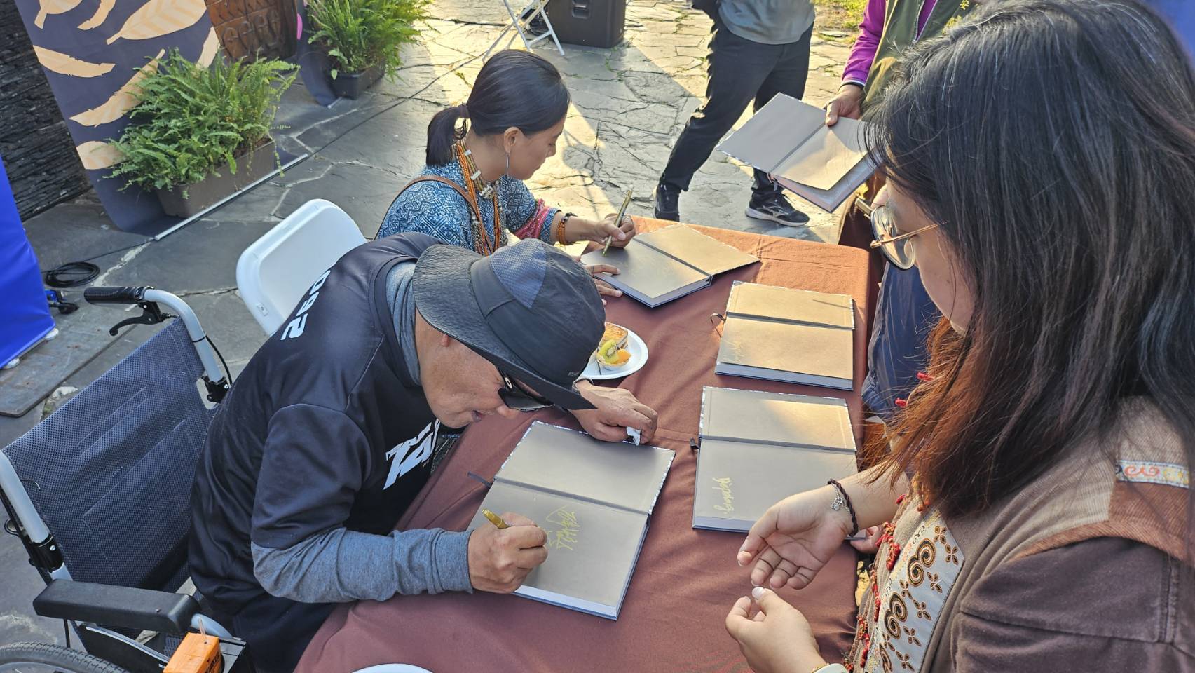 屏東縣政府原民處「部落的風」詩集新書發表會,作家秦榮輝(阿瀨)與攝影師張之萓現場舉辦簽書會,書迷大排長龍。(記者鄭伯勝翻攝)