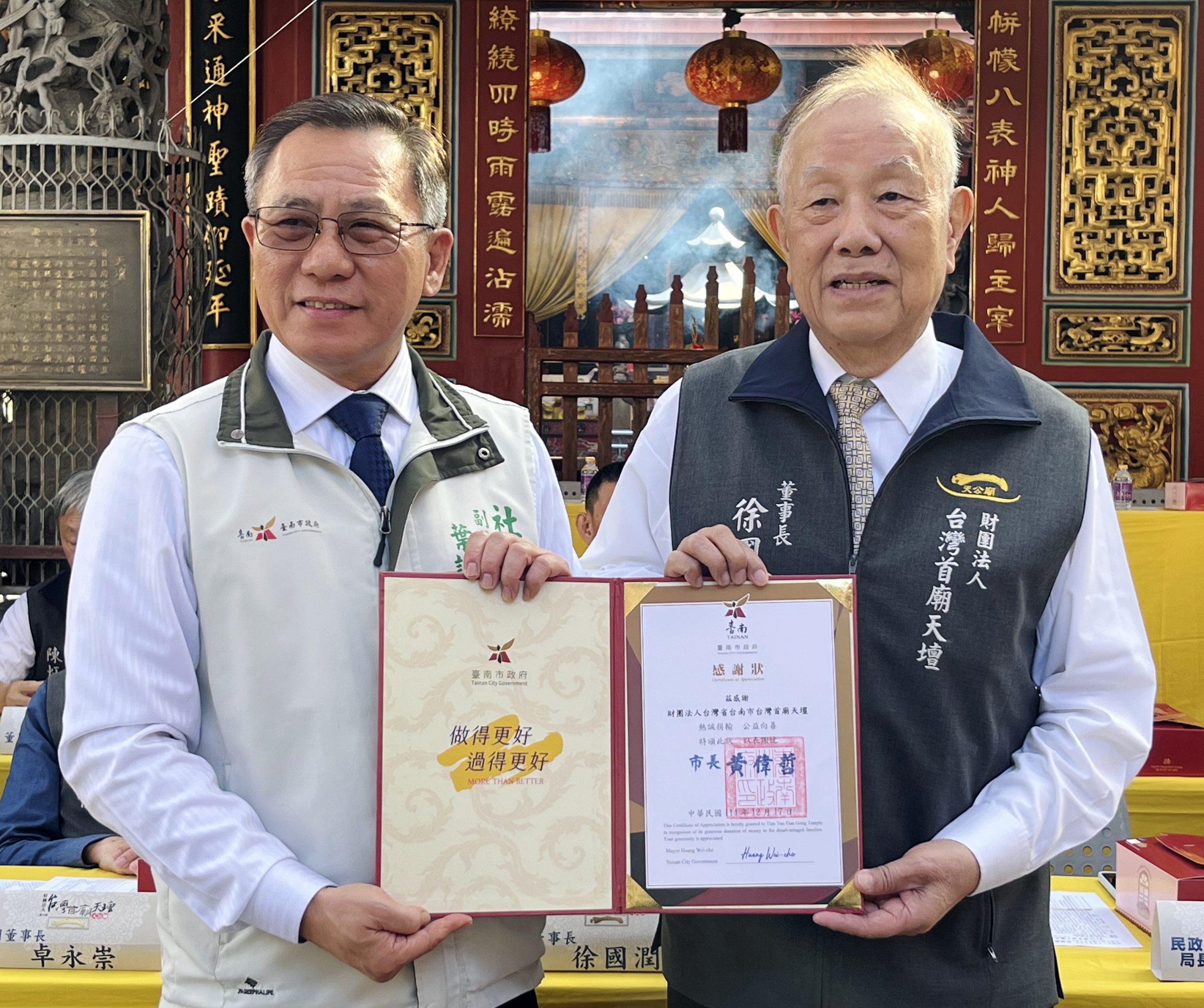 社會局副局長葉誌明致贈感謝狀,感謝天壇的善心義舉,充分展現悲天憫人及關懷弱勢的精神,提供弱勢民眾最實質的關懷。台南是有愛的城市,政府的力量有限,但民間力量無窮,天壇出錢出力行善,將十方信眾的香油錢用於社會公益,幫助更多需要幫助的人。