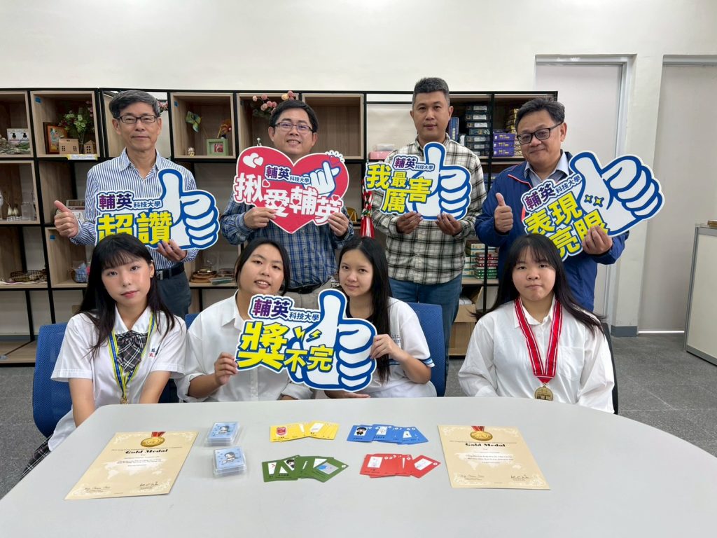 「護理益智卡牌桌遊」是由輔英健康事業管理系林政翰主任指導黃暄雯(林園高中畢)、陳姵予(陽明工商畢)同學,與鳳山商工商業經營科吳歡哲主任帶領的李承恩、許湘芸學生共同開發,並獲得鳳山商工林建宏校長、康木全實習主任的全力支持,不僅榮獲金牌還取得專利,技轉授權給逸香書坊推廣銷售。