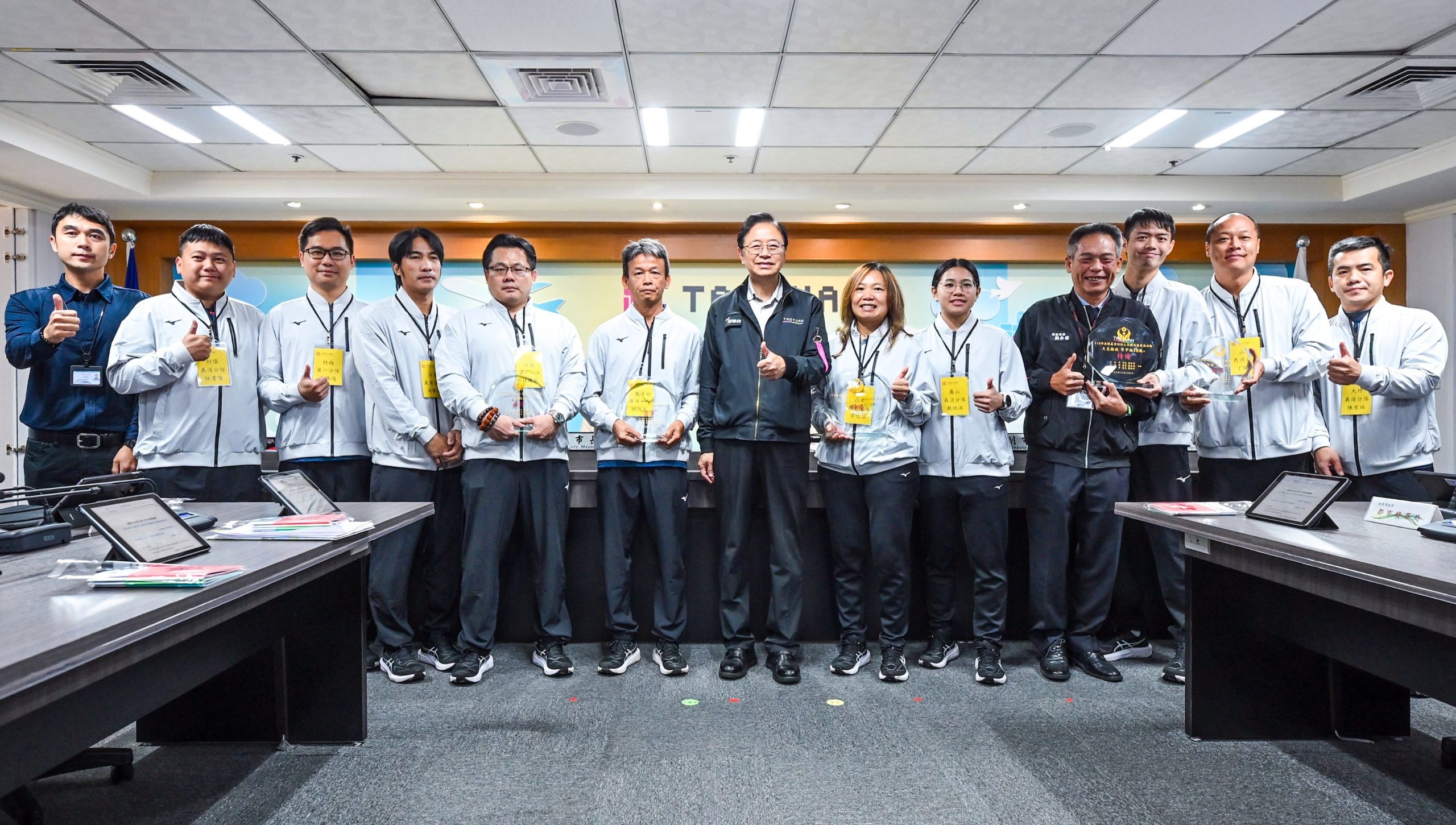 桃園市長張善政十七日上在市政會議中接受消防局呈獻榮獲消防署「一一四年全國義消人員體技能交流活動」績優獎項。張善政表示,義消人員長期與消防同仁並肩投入第一線救災工作,專業體技能不僅攸關救災效率,更關係自身安全,期勉義消夥伴持續精進訓練,在未來賽事中再創佳績。