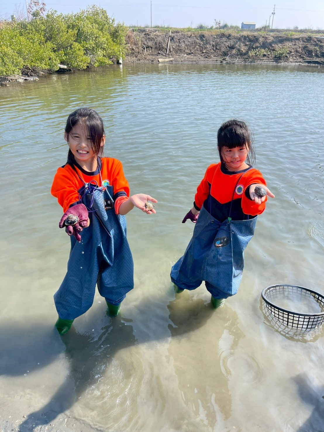 將軍區長平國小參加南縣區漁會「養殖漁業體驗營」,前往七股摸文蛤,學童穿上青蛙裝在魚塭裡摸來摸去,看到超大文蛤相當興奮,直說當漁民好辛苦。