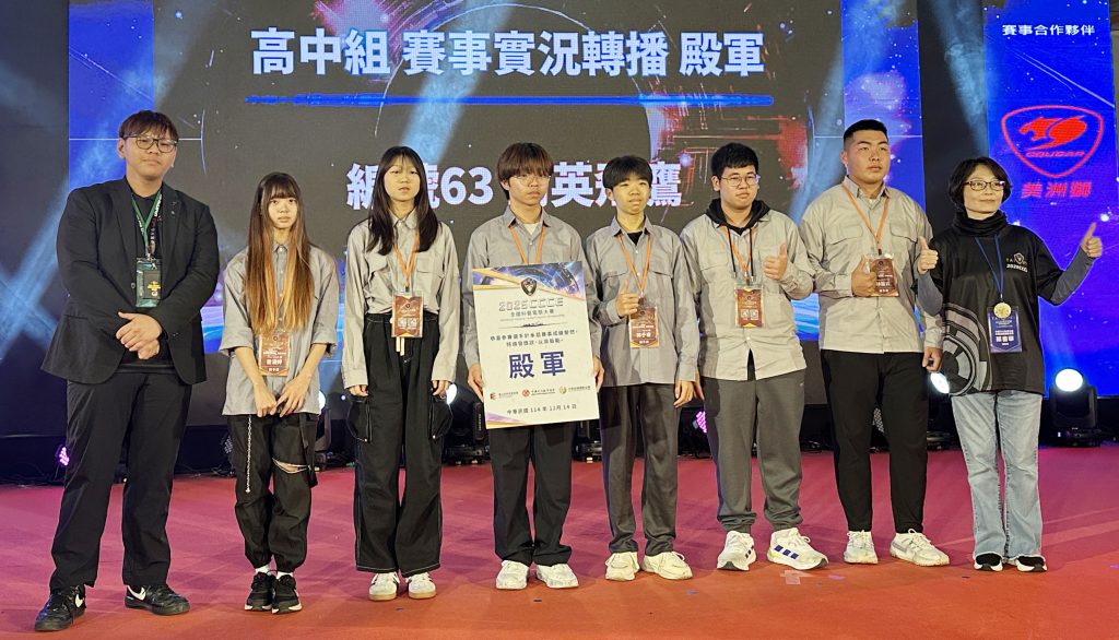 此外,在考驗臨場反應、口語表達、鏡位調度及專業知識的賽事實況轉播項目中,南英高工老師林泓凱帶領林筵霖、曾湘婷、黃品璇、蔡得誠、陳鍇太、郭于睿、李佳諭等七位同學,展現媒體傳播與電競專業領域的扎實基礎,將專業知識轉化為精彩節目內容,在眾多好手中脫穎而出,榮獲殿軍佳績。
