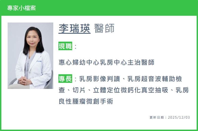 乳房在女性經歷不同時期時表現多樣,因此定期檢查是重要一環,目前政府提供40至74歲女性每兩年一次的免費乳房攝影檢查補助,若為懷孕及哺乳期則可透過乳房超音波進行檢查;李瑞瑛醫師表示,哺乳婦女應定時擠奶,飲食上避免高油脂食物並多補充水分,保持良好作息,一般而言,有助於降低乳腺炎發生的風險,若發現乳房出現任何異狀時,必要時則應盡快就醫,透過觸診以及進一步的影像學檢查,以確保乳房健康。