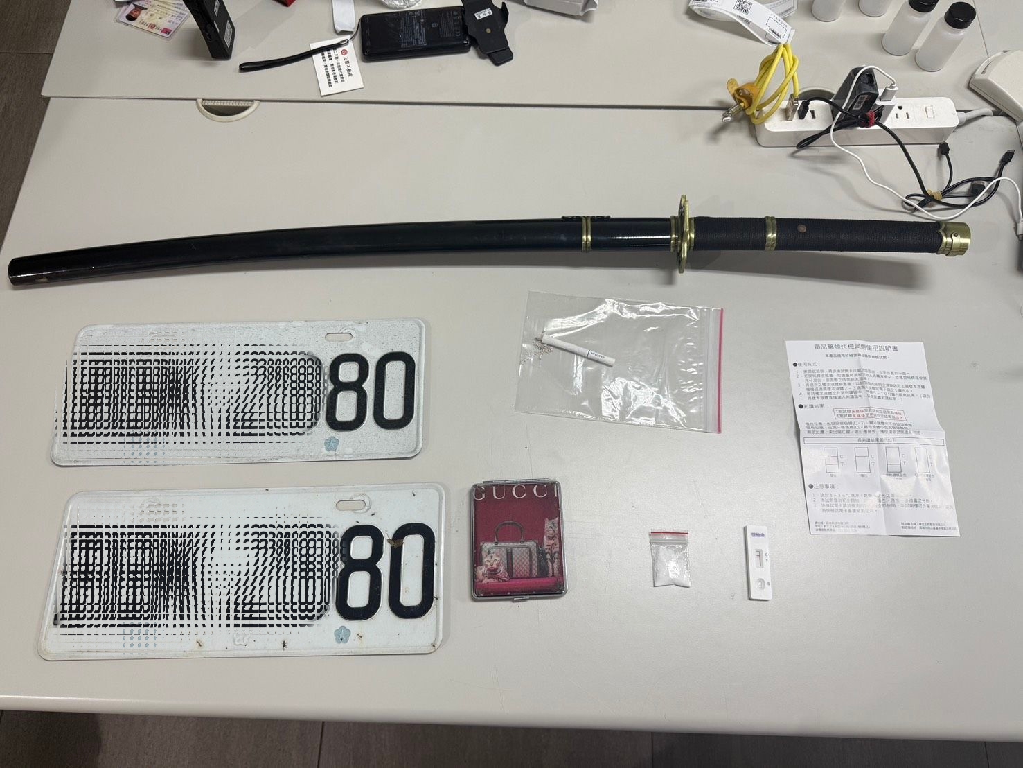 淡水警分局指出,本(12)月12日20時許,淡水警分局員警巡邏行經台二線與石頭厝路口時,發現一輛自小客車公然違規紅燈右轉,員警利用車上AI巡防系統即時查詢,發現該車牌懸掛偽造車牌,隨即通報線上警力進行攔截圍捕,於巷弄內以警車將其前後包夾,員警立即持槍喝斥:「下車!」,同時上前將車內的兩名男子拉下車,兩人為一對兄弟,分別是 22 歲的許姓駕駛和 18 歲的許姓副駕駛。當2人被拉下車後,車內濃重的K菸味道撲鼻而來,經搜索查獲K他命1包及 K 菸1根,更令人心驚的是,隨後在車內清查時,後座發現了一把已開封的武士刀。