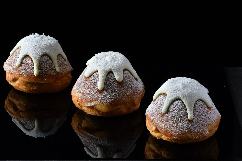 東京巴黎甜點富士山生泡芙源自日本近期社群爆紅的排隊名品生泡芙,由日本師傅傳授指導,東京巴黎甜點以日式正宗製程為基礎,在台灣進一步把日式生泡芙升級再造,將泡芙、杏仁奶油香氣的費南雪與法式布蕾三種甜點工藝融合於一顆富士山造型甜點中。外層酥脆泡芙殼、內層濕潤杏仁奶油香氣的費南雪,中心注入大量以法國鮮奶油及比利時發酵奶油製成滑順濃郁布蕾內餡,一顆即可同時品嚐三種口感層次。並以獨特工法將外形塑造出山型外觀,山頂覆蓋厚厚一層白巧克力,絲滑流線彷如富士山頭雪冠,最後再撒上被譽為「海鹽中的皇后」的鹽之花,優雅冷冽的視覺美感,是顏值及美味兼具的甜點界天花板之作,將之放置在手中宛如冬日富士山降臨台北街頭。首波以2種口味登場,包含經典原味(99元)與開心果口味(109元),為快閃店活動期間限定販售,快閃活動首兩日只送不賣。
