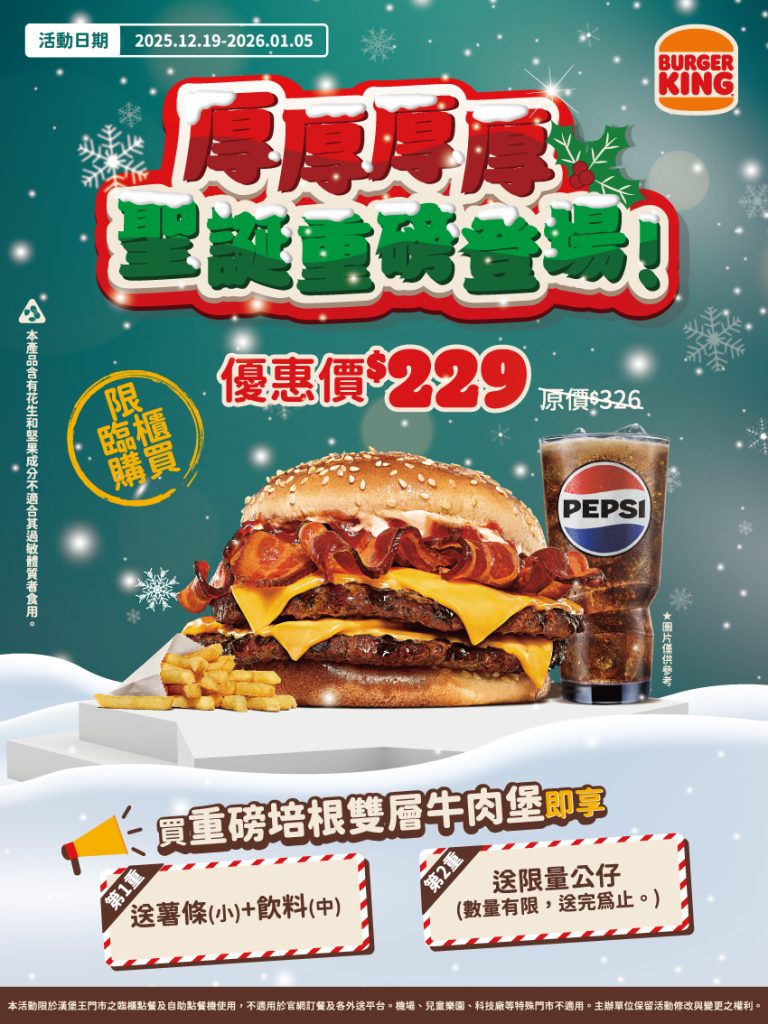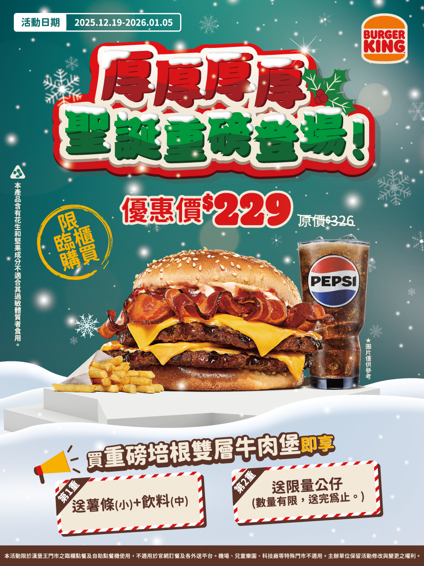 聖誕節吃漢堡王就是賞自己雙層大禮,週五(19日)起原價326元的重磅培根雙層牛肉堡套餐,臨櫃點餐只要229元就可以暢快享用,等於買漢堡無痛直升套餐,爽嗑8盎司火烤牛肉和香脆培根,還隨餐送限量公仔(送完為止),豐盛度沒有極限,歲末好康只到2026年1月5日。