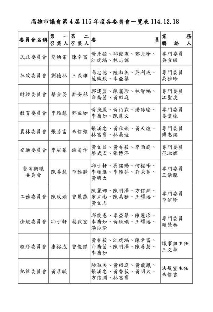 高雄市議會十八日下午順利成立明年各種委員會,其中警消衛環委員會廿五人爭取九席次最為搶手,以抽籤決定席次。歷經四輪登記、抽籤,順利產生所有委員會席次。