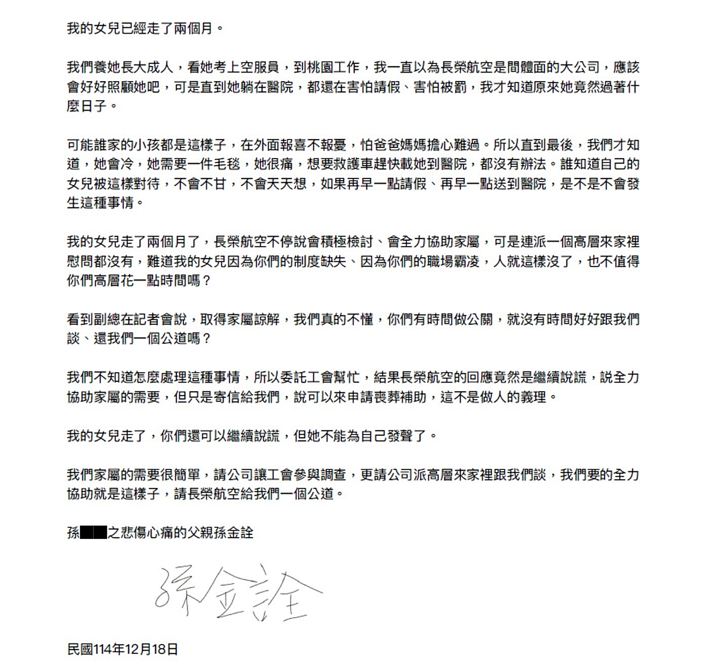 桃園市空服員職業工會十九日代轉孫姓空服員家屬聲明稿,在聲明稿中孫姓空服員家屬聲淚俱下表示:「我的女兒已經走了兩個月,我們養她長大成人,看她考上空服員,到桃園工作,我一直以為長榮航空是間體面的大公司,應該會好好照顧她吧,可是直到她躺在醫院,都還在害怕請假、害怕被罰,我才知道原來她竟然過著什麼日子。」