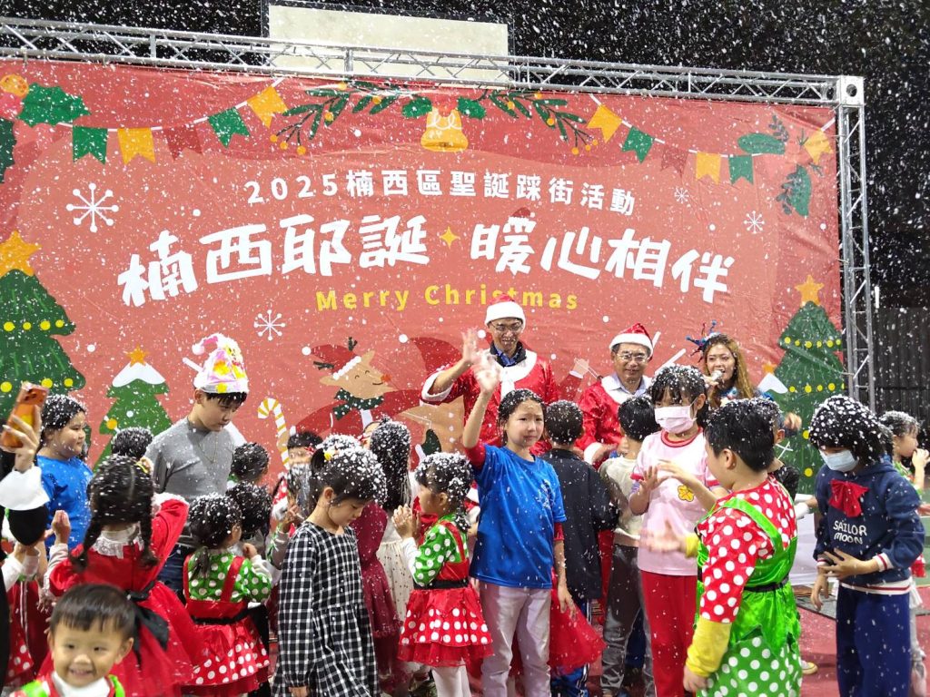 當踩街隊伍走到楠西公園風雨球場後,熱情的表演節目陸續登場,首先由「台灣基督長老教會楠西教會」的「棒鐘團」演奏聖誕曲目揭開序幕,炒熱耶誕歡樂氣氛;接續由佳安幼兒園、吉兒堡幼兒園及楠西國小附幼等帶來一連串幼兒律動表演,展現小朋友們最純真的光芒;壓軸好戲是小朋友最期待的帶動唱及造雪機飄出來的片片雪花,秒讓現場充滿著雪花隨風飄,讓在場大小朋友們雀躍不已。