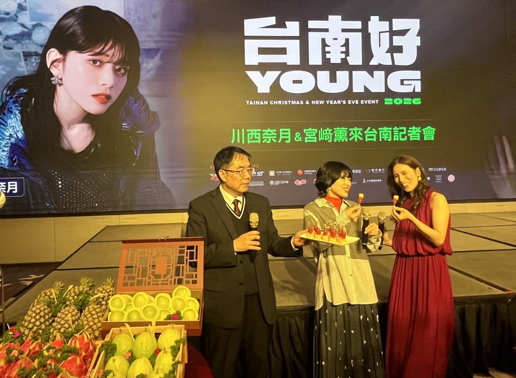 見面會會場擺設很多台南特色水果、特產,黃偉哲逐一介紹,兩位日本藝人小口品嘗之後,不斷點頭說「歐依西」,都表示在演場會空檔一定會設法在品嘗和採購回家給親友分享。