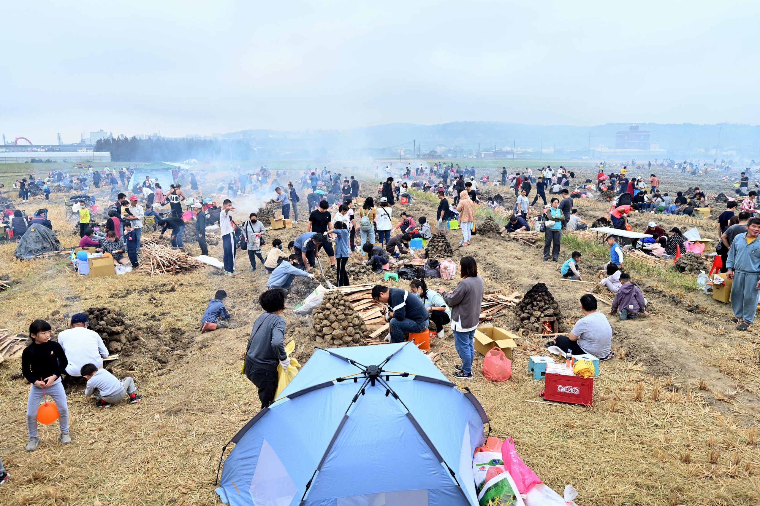 後龍鎮公所連續第十年舉辦甘藷花生節及「焢窯」烤番薯活動,一年比一年盛大,其中一直最受歡迎的「焢窯」,一早就吸引上千位鄉親走入建興路與新港三路交叉口附近農田,很多人呼朋引伴,場面熱鬧。
