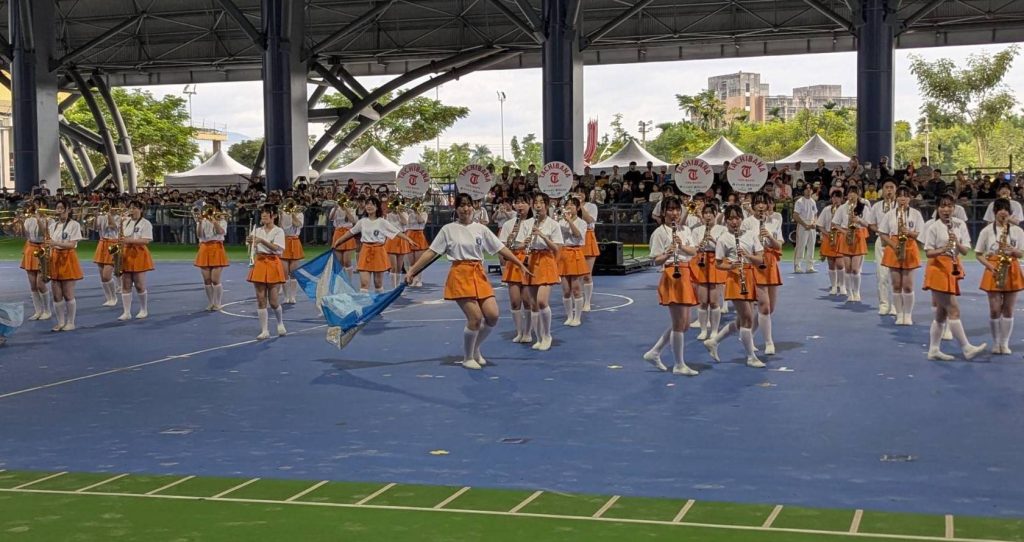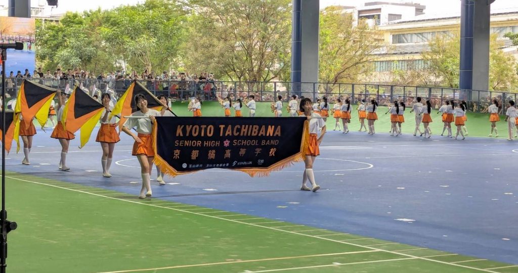 最受矚目的「橘色惡魔」京都橘高校吹奏樂部壓軸登場,以活力、笑容及夢想滿滿的風格聞名,一出場立即引起全場熱烈歡呼。橘色惡魔以經典的橘色制服、俐落隊形與充滿感染力的舞步,搭配強而有力的吹奏技巧,帶來多首青春動感的曲目,展現世界級行進樂團的高水準演出,震撼全場,掌聲不絕於耳。事後縣長周春米贈送琉璃珠手環作為紀念禮物,期待她們日後有機會再造訪屏東。