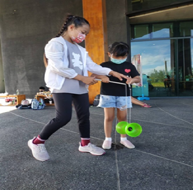 除了擔任志工,方悅晞是國華國中二年級學生,擅長扯鈴,她常利用課餘時間指導學童技巧,將民俗運動表演與公益結合,鼓勵更多青少年投入志工服務。