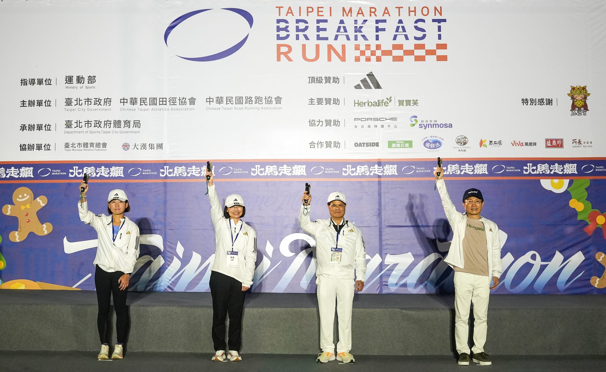 2025台北馬拉松21日開跑。為迎接年度賽事,市府20日首次舉辦節慶兩週的「耶誕歡樂早餐跑」,由體育局長遊竹萍鳴槍,吸引許多跑者參與。