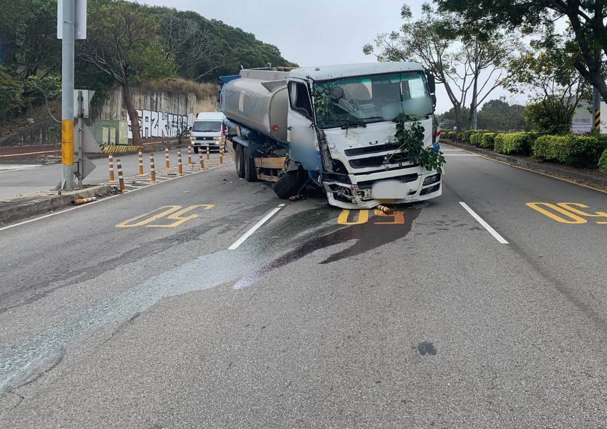 中油司機忘拉手煞車 油罐車衝車道撞牆車頭毀