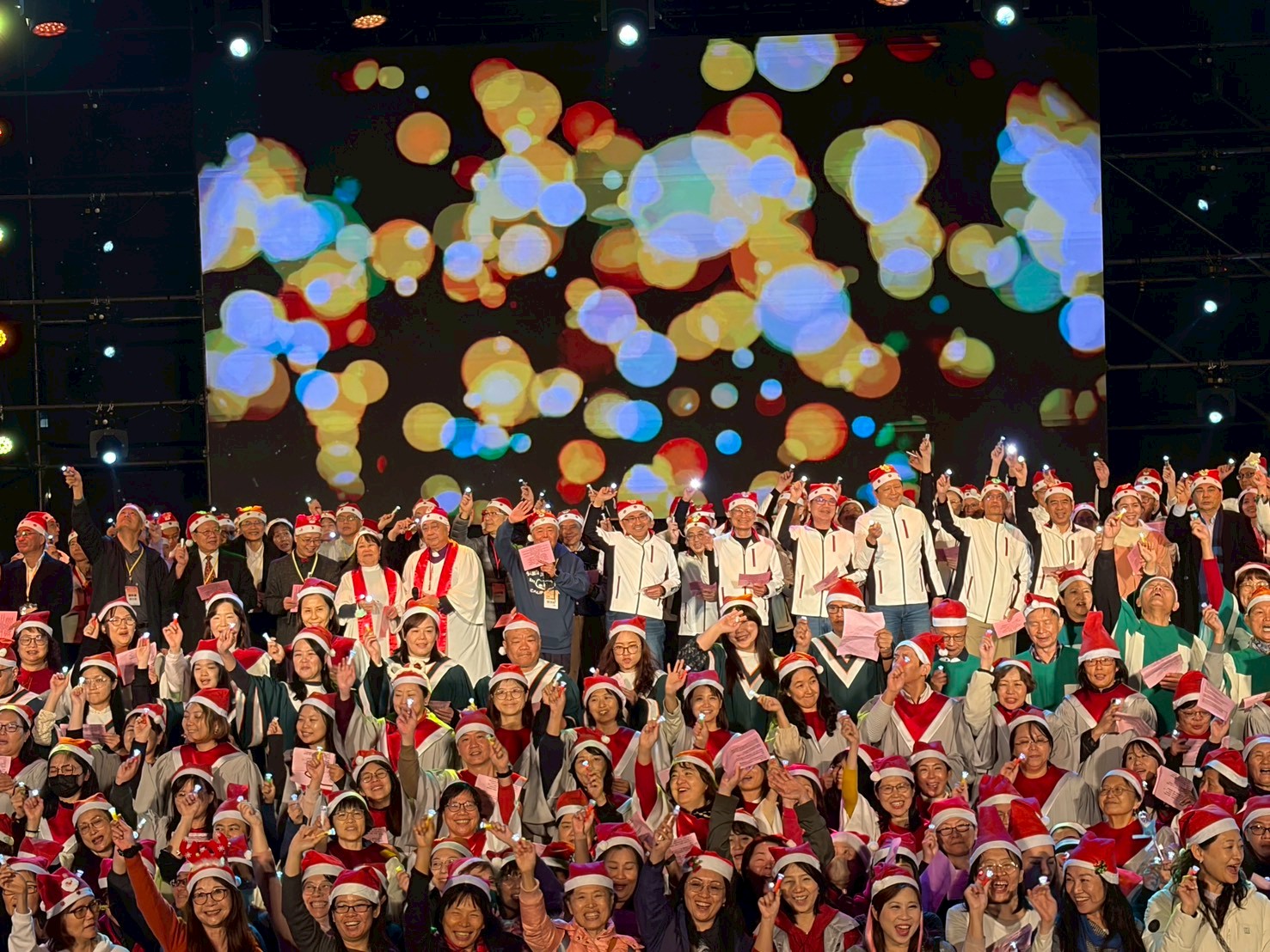 2025新北市耶誕平安晚會圓滿完成!今(21)日活動從下午的愛心園遊會到晚間的平安晚會,洋溢濃厚的耶誕氣氛,吸引大批民眾參與。新北市長侯友宜晚間領銜市府團隊與各教會牧長、百人詩班向萬名遊客報佳音,為城市送暖,與現場民眾一起唱和《普世歡騰》、《平安夜》、《是為了愛》等聖誕詩歌,嘹亮歌聲響遍耶誕城,傳遞愛與祝福。