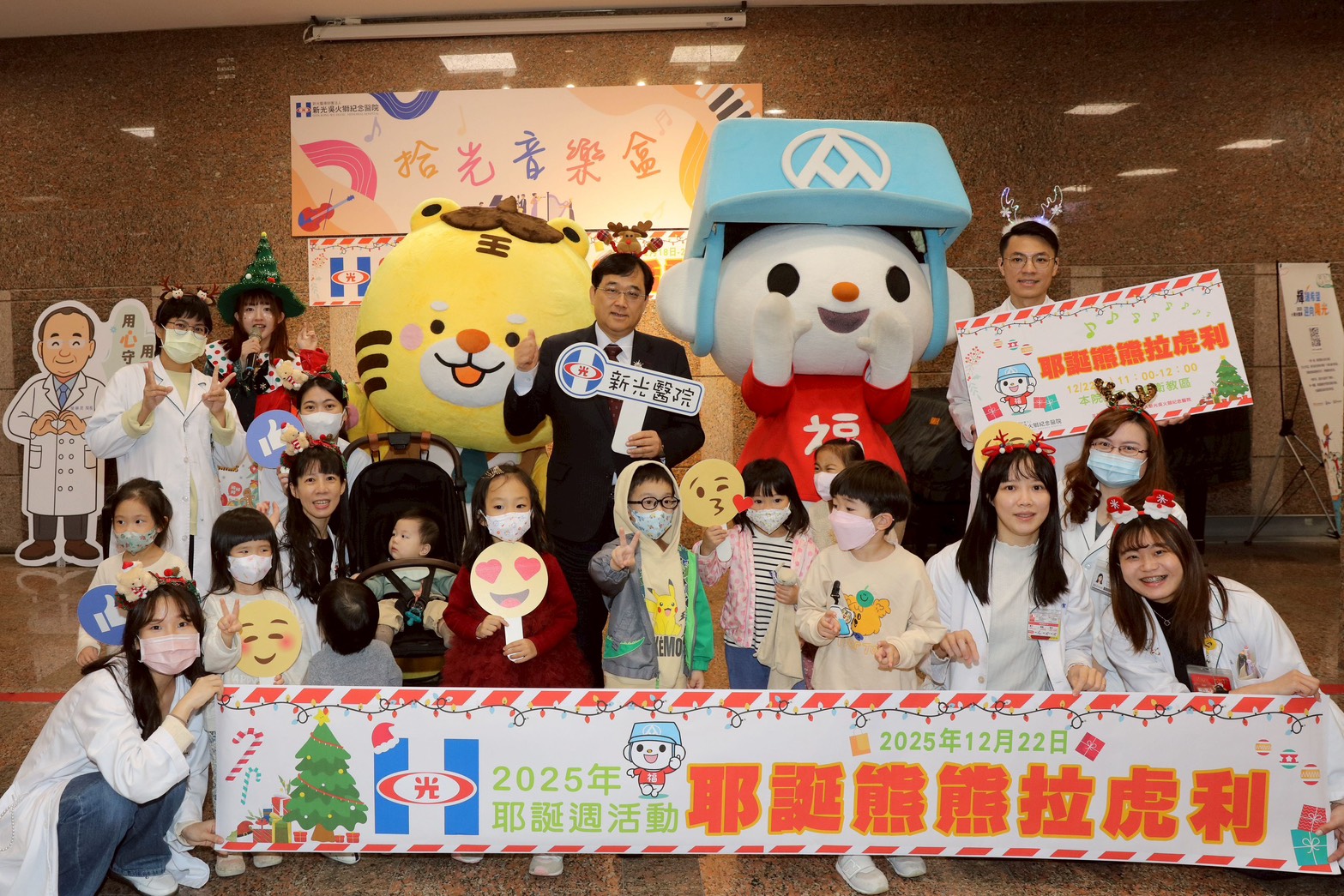 耶誕送暖不缺席!2025新光醫院耶誕週活動,由新光醫院行政副院長洪子仁、社會服務室課長朱健豪帶領院內同仁、全聯人氣主角「福利熊」、全支付吉祥物「虎利」一起陪伴病童歡度佳節。