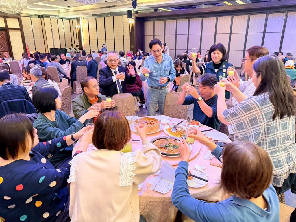 台南市新聞記者公會舉行會員大會並改選理監事,理事長李明威(後中著西裝者)卸任交棒給新任理事長雙子星有線電視總經理陳建村(後中著藍衣者)。(公會提供)