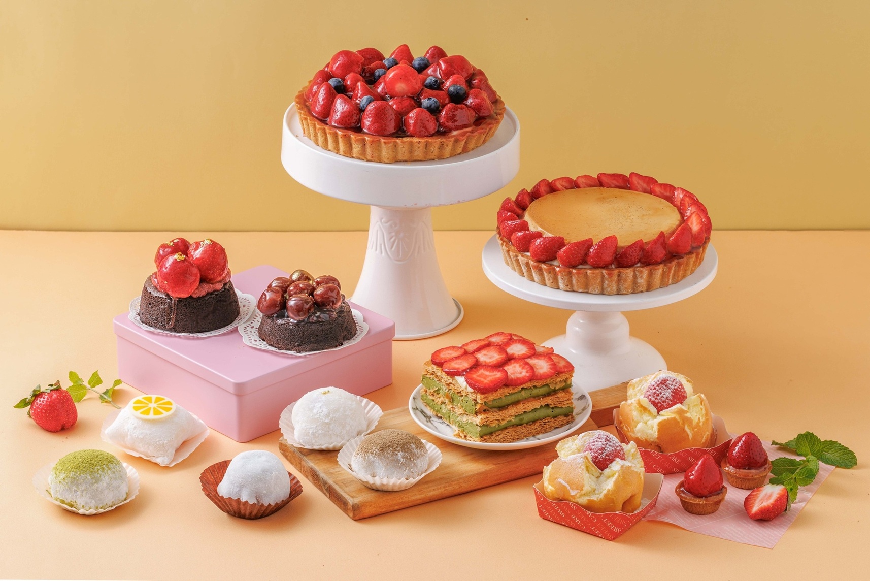 貓茶町「成熟茶韻X果香甜美」草莓季限定商品六大主題系列,從一口甜點、日常單品,到適合聚會分享的節慶蛋糕,完整勾勒出一條「大人也會想吃的草莓甜點路線」。「草莓塔系列」包括草莓巨無霸布丁塔、香草草莓塔、包種茶草莓塔三大品項與5吋、7吋兩種尺寸規格;「大福系列」包括原味草莓大福、紅豆草莓大福、包種茶草莓大福、蜜香紅茶草莓大福、鐵觀音巧克力草莓大福、北海道乳酪大福、砂糖橘大福七大口味;「舒芙蕾系列」草莓舒芙蕾單品;「千層派系列」草莓包種千層單品;「巧克力貝可拉蛋糕系列」包括草莓小可愛及櫻桃小可愛兩種口味;「一口塔系列」一口草莓塔單品,共多達十幾款品項甜品,透過不同茶種的香氣、回甘與焙火特性,重新整理草莓在甜點中的風味節奏,展現台灣茶與在地水果的多元搭配可能。
