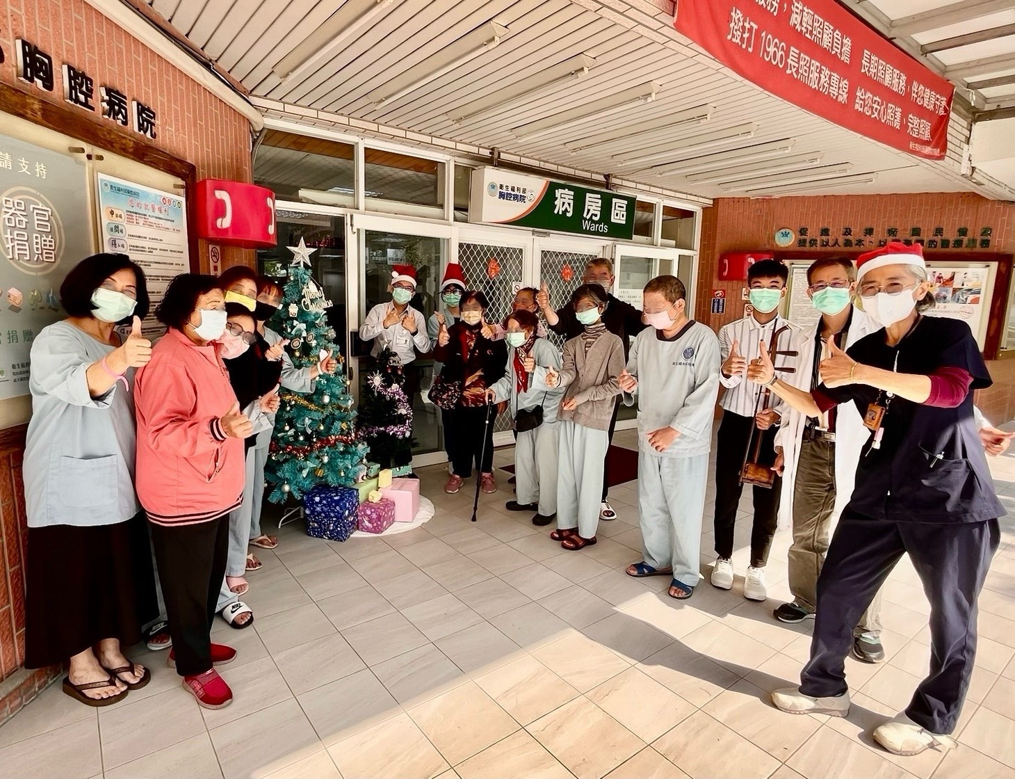 聖誕節前夕,衛福部胸腔病院二十三日在住院大樓大廳舉辦溫馨的病房聖誕活動,透過音樂、手作與陪伴,為住院病人帶來節慶的祝福與暖意,讓醫院空間洋溢著溫柔而歡樂的氣氛。