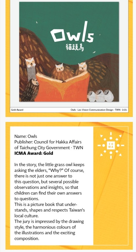 台中市政府客委會推動客語文化創作成果再傳捷報,客語繪本《貓頭鳥》以溫潤細膩的圖像風格與生動自然的客語文字,描繪台中山城客家重要祭典文化,打動國際評審目光,榮獲德國「ICMA國際創意媒體大獎」書籍類兒童與青少年書籍金獎,以及美國「Moonbeam兒童圖書獎」二0二五年度評審金獎,成為少數同時獲歐美國際大獎肯定的客語繪本。