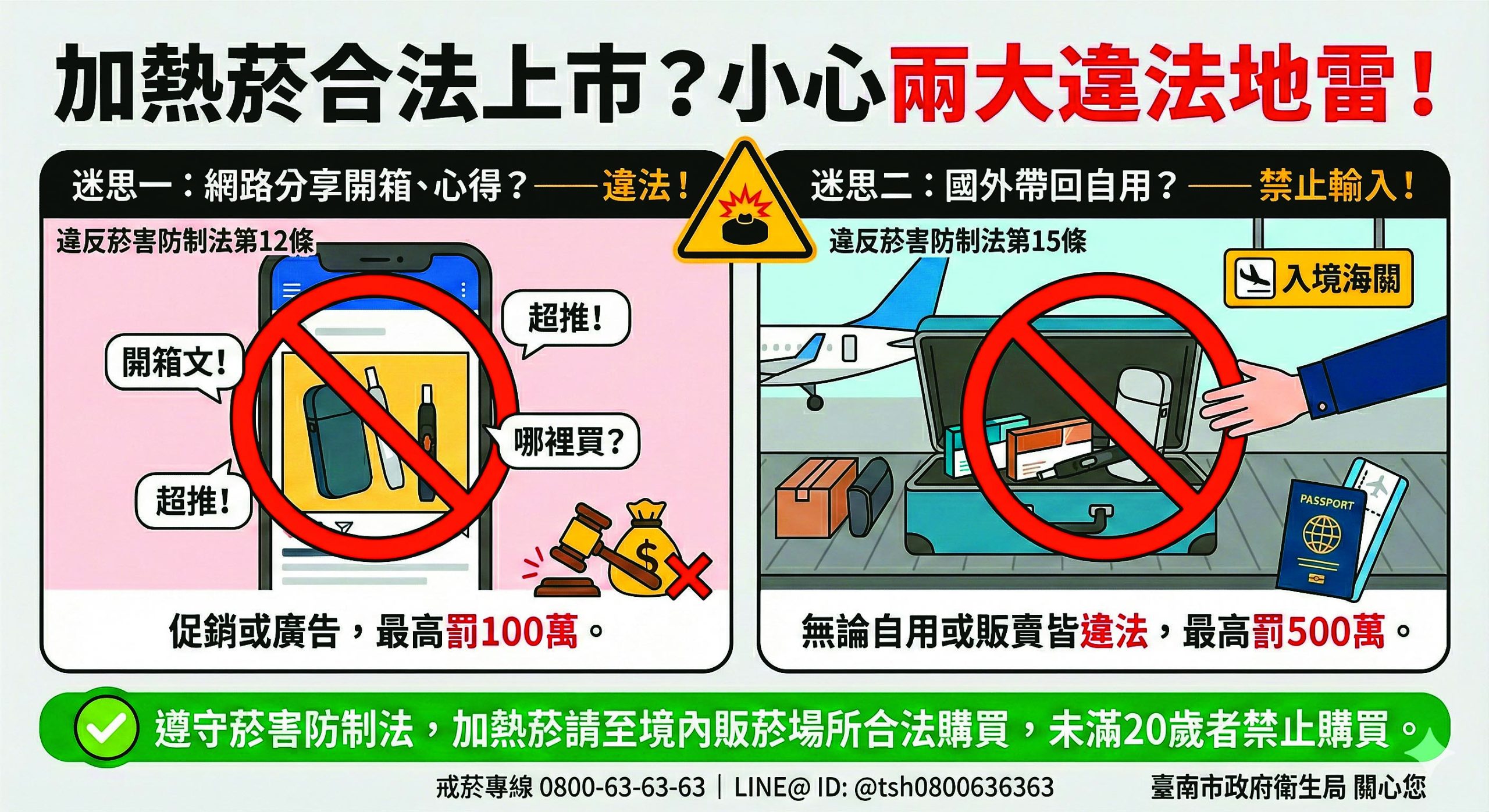近期加熱菸合法上市並於各通路售賣,然而使用加熱菸仍須注意法規。南市府衛生局表示,除菸品宣傳、促銷或變相廣告違法外,加熱菸不論自用或販賣,都禁止從國外帶回!相關行為仍需遵守菸害防制法規範,也提醒癮君子特別留意,以免誤觸法規。