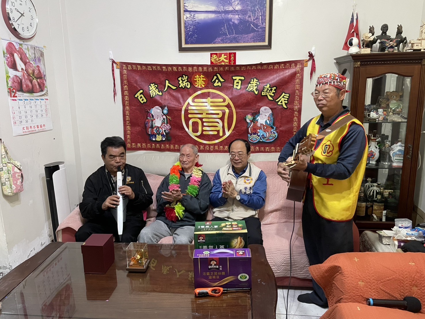 榮民葉起爺爺(左二)百歲嵩壽,台南市榮服處長王國能(右二)率志工前往祝賀。