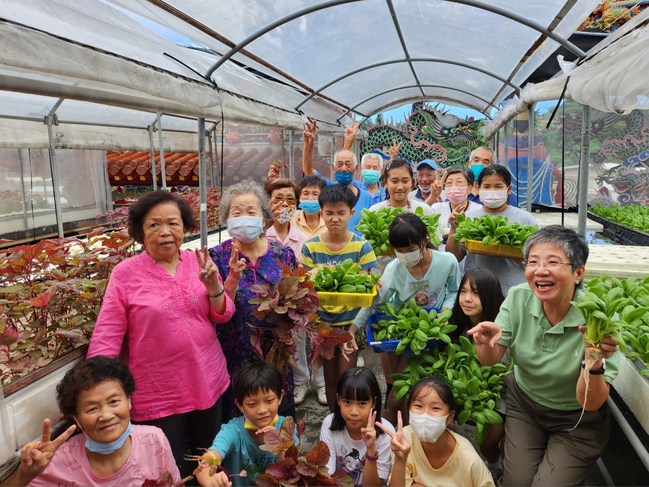 金包里慈護宮聖母大樓頂樓設有空中菜園 有園藝療育效果 祖孫同樂 還有「媽祖菜市集」 右1即為據點秘書長曾碧霞。(新北市社會局提供)