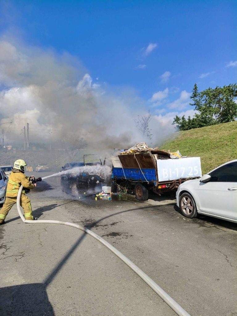 消防隊抵達後以水注灌救起火的小貨車。(民眾提供)