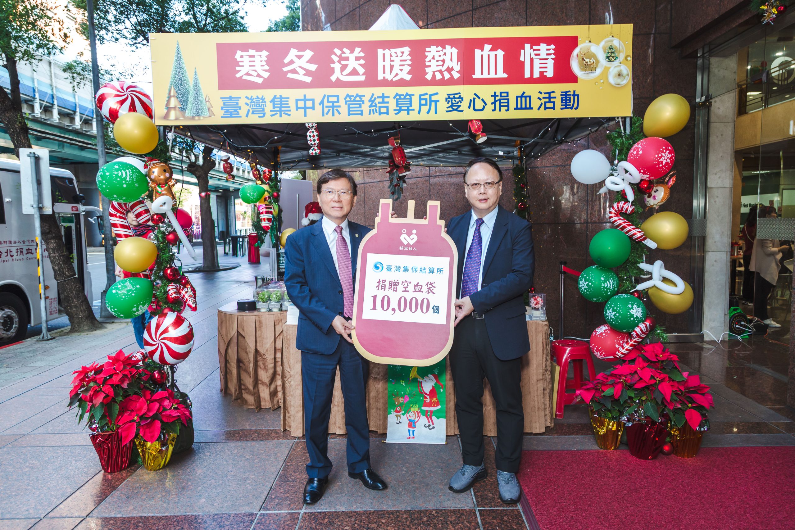 集保結算所董事長林丙輝(左)代表公司捐贈1萬個血袋予台北捐血中心,由該中心主任林敏昌(右)代表接受。(集保提供)