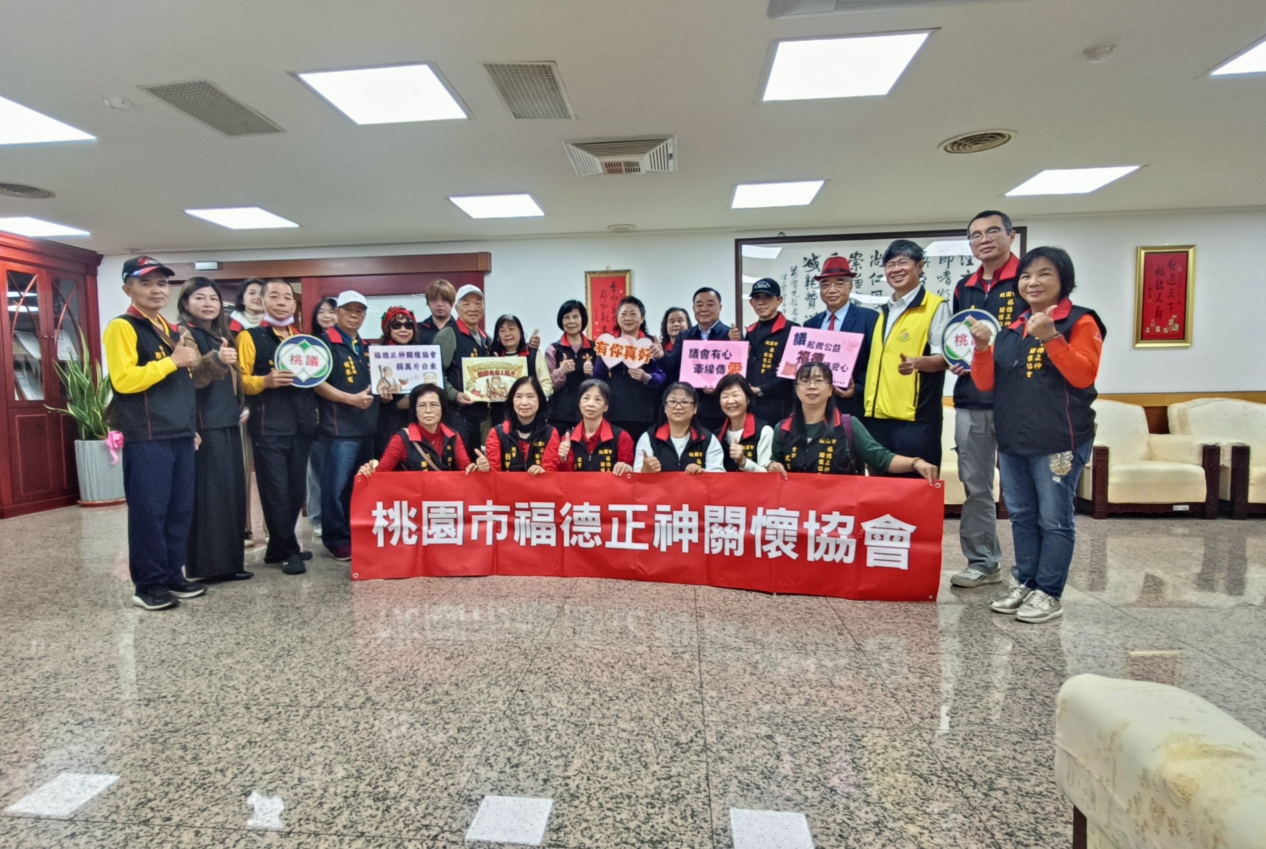 桃園市福德正神關懷協會理事長鄭正揚與二十多名會員,是在桃園市政顧問藍勝民陪同下到桃園市議會,請議長幫忙轉發募得的一萬斤白米給中壢區的弱勢家庭。