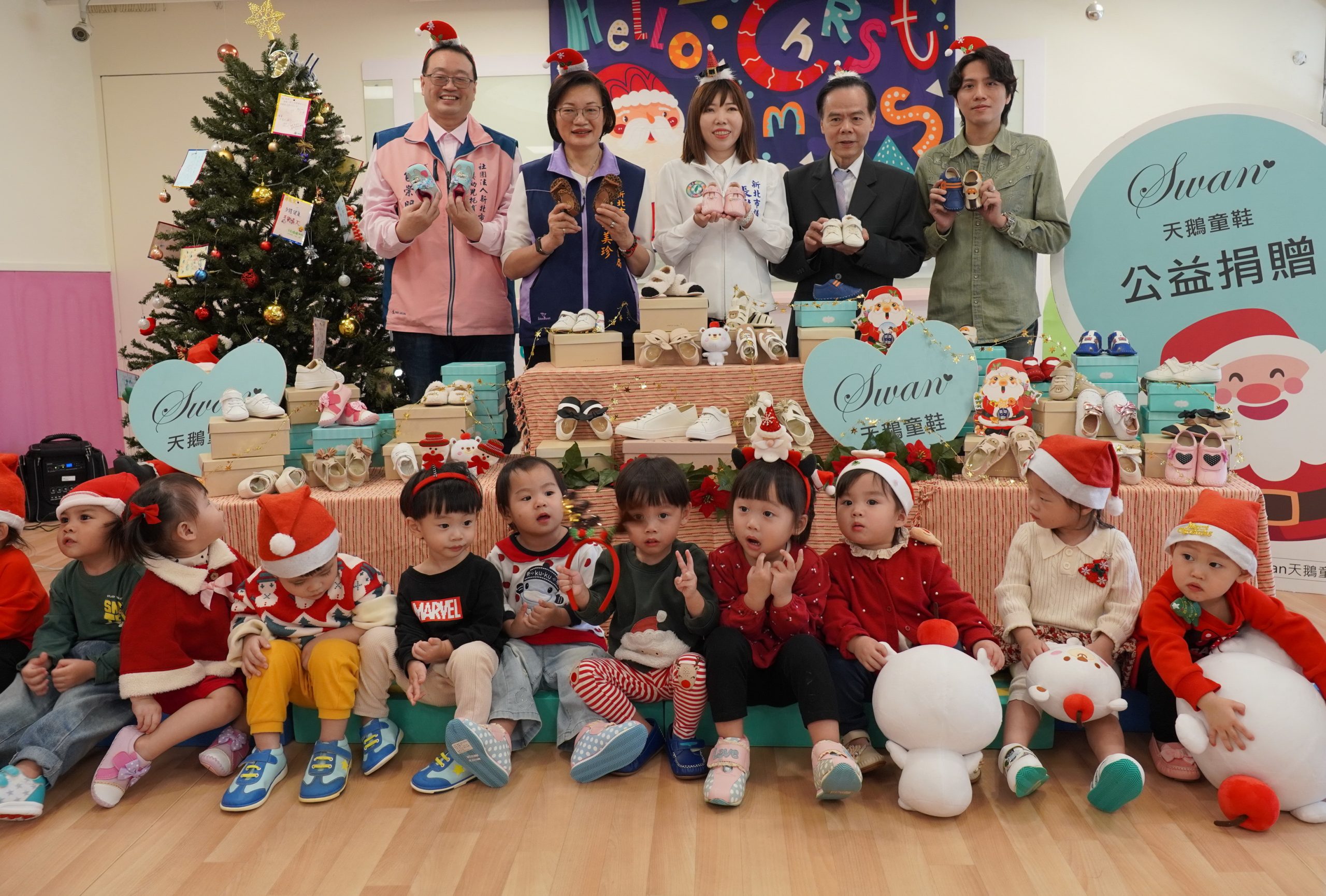 美萬新企業總經理王秋鴻表示,企業深耕中和多年,自創「天鵝童鞋」品牌,始終堅持台灣手工製鞋工藝,嚴選皮革材質,以一針一線縫製出舒適、耐穿的優質童鞋,捐贈自家產品給公托孩子當聖誕禮物,希望孩子們穿著快樂長大。