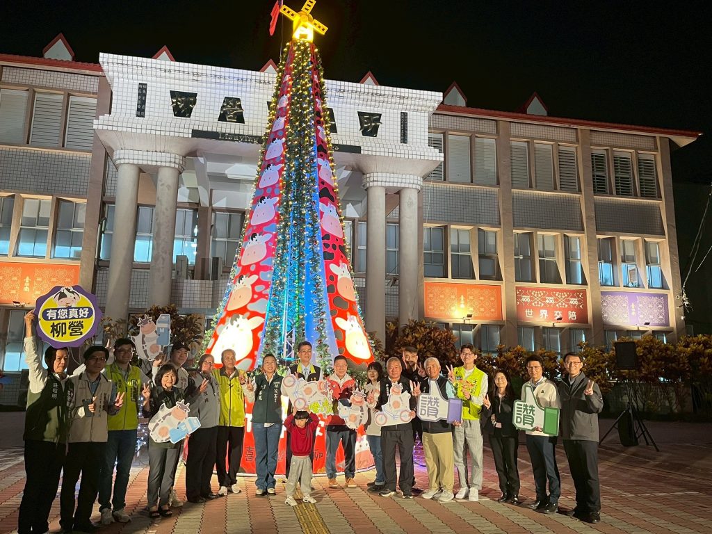 主燈耶誕樹高達八米,底座以圓形可愛乳牛造型呈現,夜間點燈後營造溫暖夢幻的節慶氛圍,樹頂融入柳營地景風車意象,巧妙結合地方文化與耶誕元素,成為民眾拍照打卡的熱門景點。