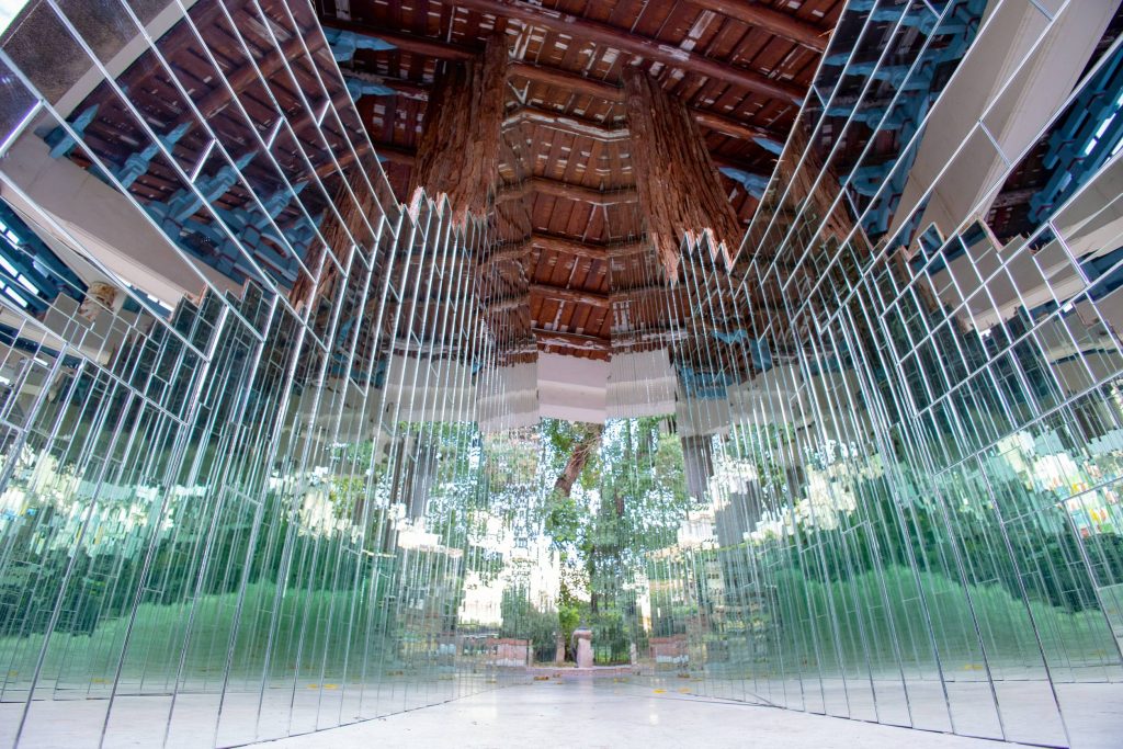 藝術家栗林隆進駐鹽水兩個禮拜的期間,在修德拜亭感受場域的歷史氛圍與空間,與台灣的工班師傅一起現地搭建架構與材料配置,過程中原先預期的樹皮材料不敷使用,幸好透過藝術家游文富居中牽線,獲台大實驗林支援,大量取得創作樹皮材料,才能充分呈現作品完美的樣貌。