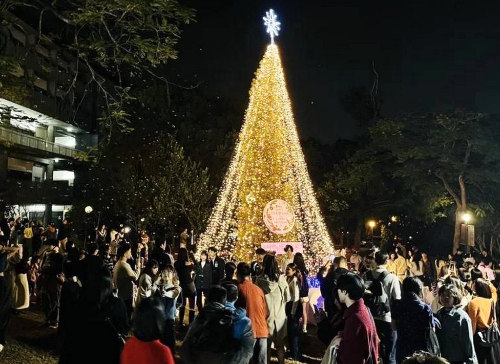 東海大學二十四日晚舉辦年度平安夜活動,今年以「為愛降生」為主題,在路思義教堂舉行平安禮拜,同步點亮校園聖誕燈飾;校園內是全台唯一的夜光玫瑰園,並首度與九公尺高的永續耶誕樹整合,吸引超過二萬人次湧入校園,創下近十年新高。