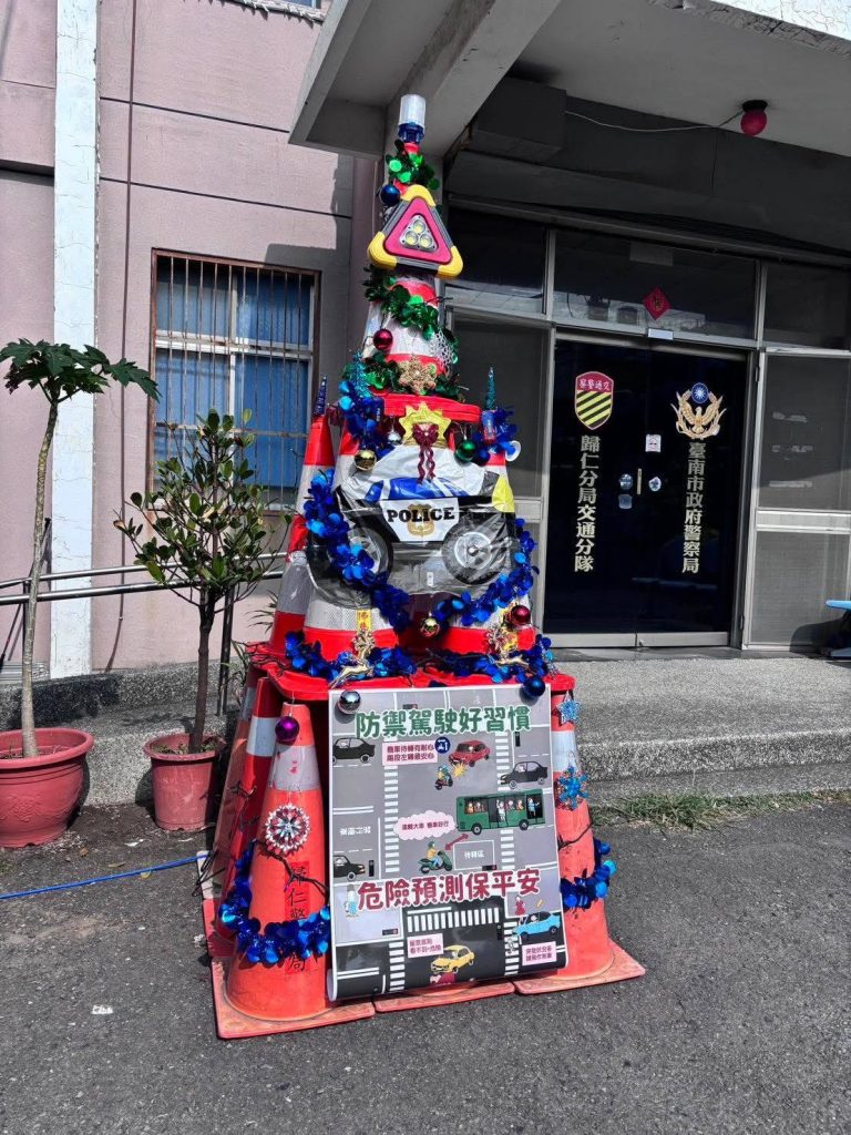 歸仁警分局交通分隊迎接聖誕節及新年,發揮巧思以交通錐、指揮棒、警用肩燈及警示燈等,組成應景的「耶誕樹」充滿交通意象,搭配明亮燈光十分吸睛。