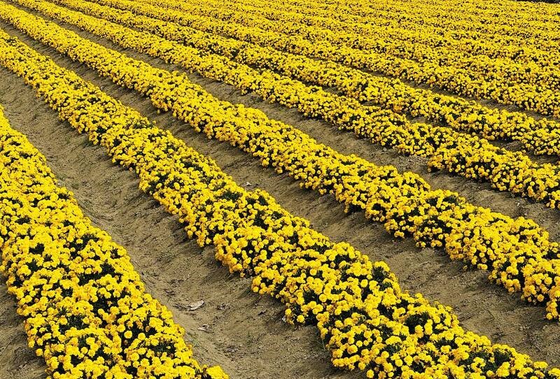 新港安和村花田盛開,被譽為「嘉義版普羅旺斯」。圖為與日本契作採籽用的萬壽菊。(記者湯朝村攝)