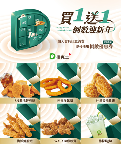 看準歲末年終的消費情境,德克士推出高 CP 值優惠作為解方,主打「倒數日曆天天買一送一」,自 2025 年底一路陪伴消費者倒數到 2026 年,天天都有不同餐點加入優惠行列,讓年底到新年的每一場聚餐,都能吃得滿足、也省得有感。