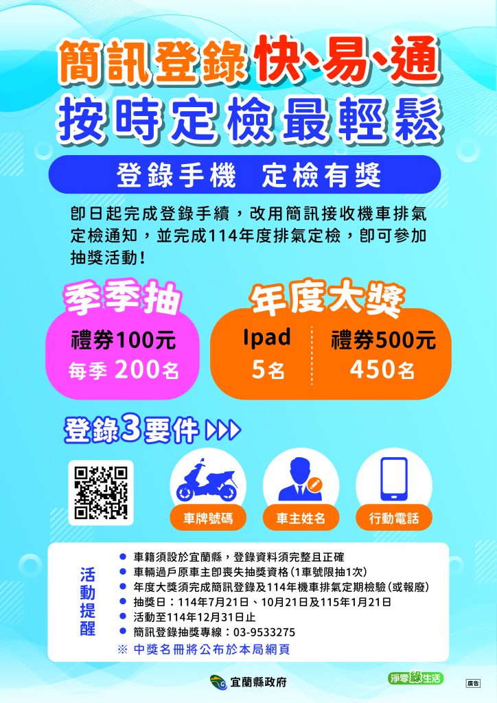 宜蘭縣今年度機車定檢簡訊登錄及電動二輪車補助雙重優惠倒數計時。環保局提醒,民眾於年底前完成線上「機車排氣定檢簡訊登錄」登錄即可參加抽獎,同時購買電動二輪車或純報廢老舊機車者,也應儘早完成相關程序,把握補助機會。環保局呼籲民眾主動完成登錄與定檢,共同落實污染減量,提升空氣品質。