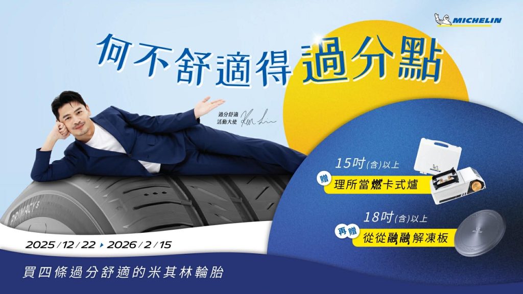 米其林在馬年以「過分舒適」為主題,延續「舒適圈」精神,邀請消費者大膽正名自己的舒服。為呼應「過分舒適」的生活態度,特別於春節前推出「過分舒適購胎禮遇活動」。即日起至2/15止,凡於指定通路購買四條15吋(含)以上米其林輪胎,即可獲得「理所當燃卡式爐」乙組;購買四條18吋(含)以上輪胎,再加贈「從從融融解凍板」乙組。