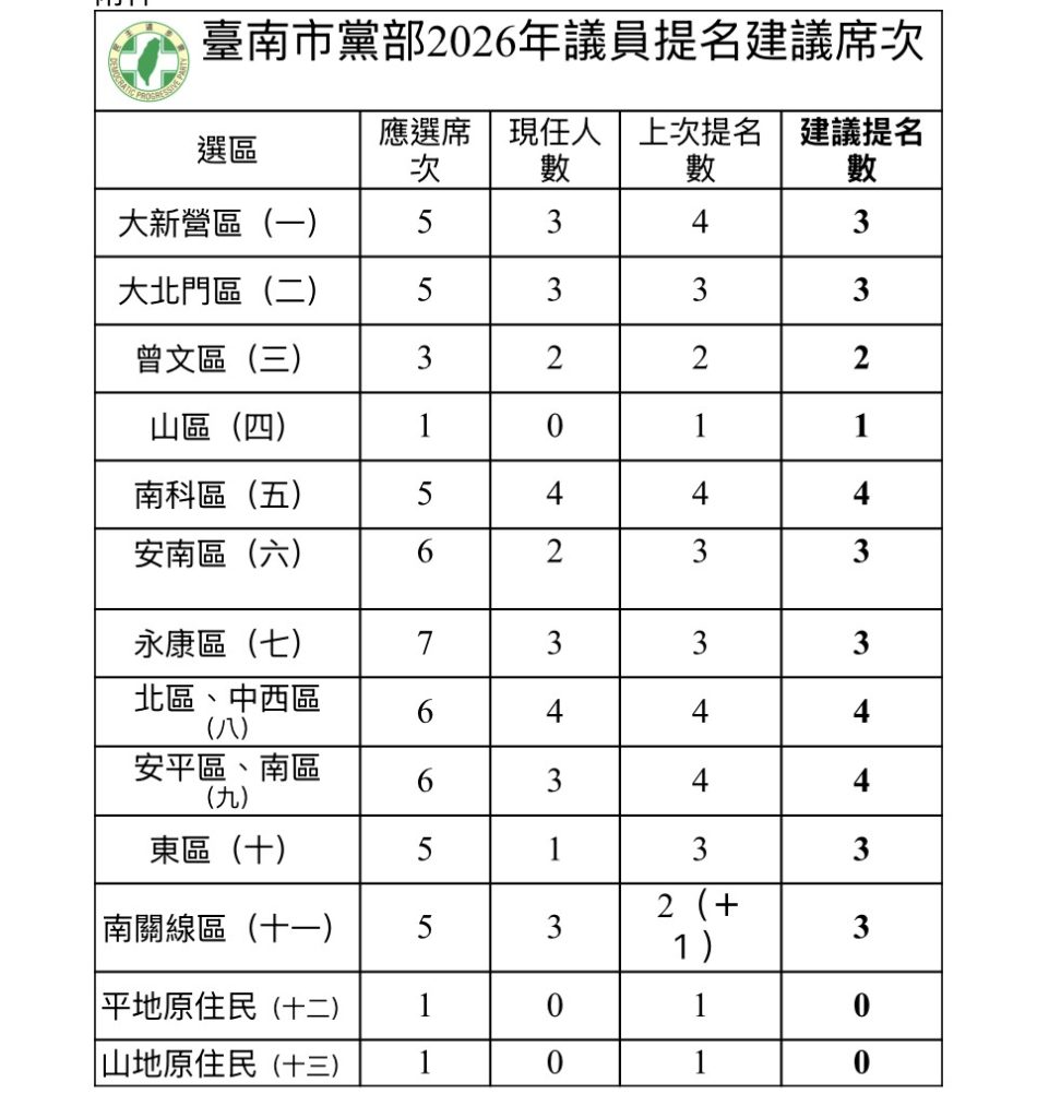 為提早備戰明年地方大選,因應當前情勢,民進黨台南市黨部二十六日開會通過各選區議員提名建議席次,總計三十三席,較目前的二十八席增加五席,將提報黨中央核定。