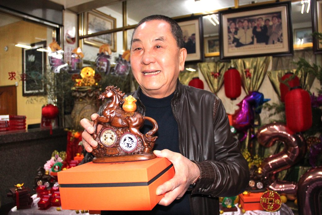 紫南宮發表馬年錢母,主委莊秋安開心展示「馬上有錢」精裝版套組。 (記者劉晴文攝)