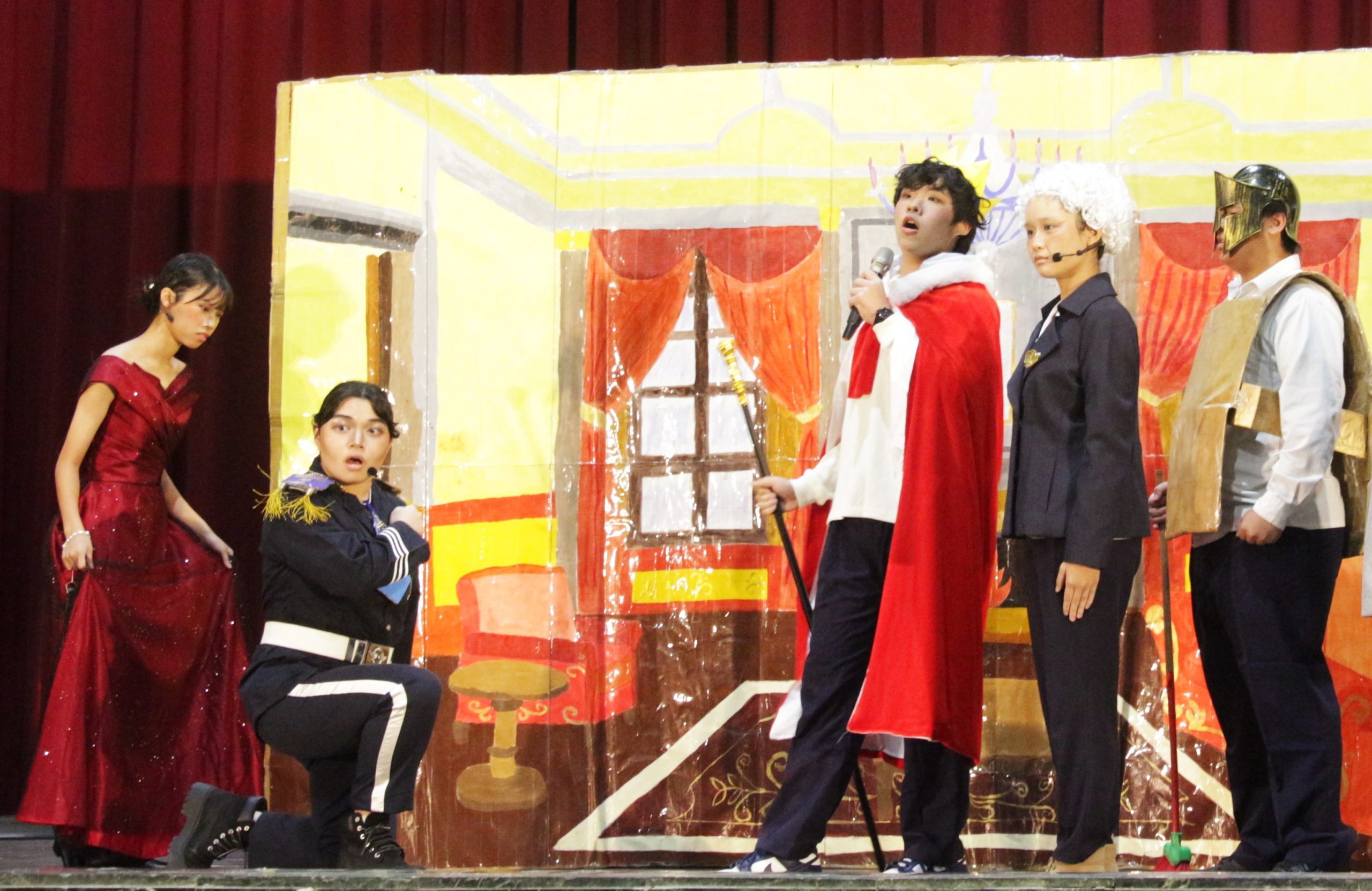 在教師團隊引導下,學生從劇本編寫、角色詮釋、走位排練,到燈光、音效、舞蹈與配樂剪輯,皆親自參與。道具與服裝設計更融入環保理念,利用回收紙箱製作大型手繪布幕、廢棄課桌椅製作道具,或將包裝紙、舊衣物改造成亮眼戲服,充分展現創意與永續精神。