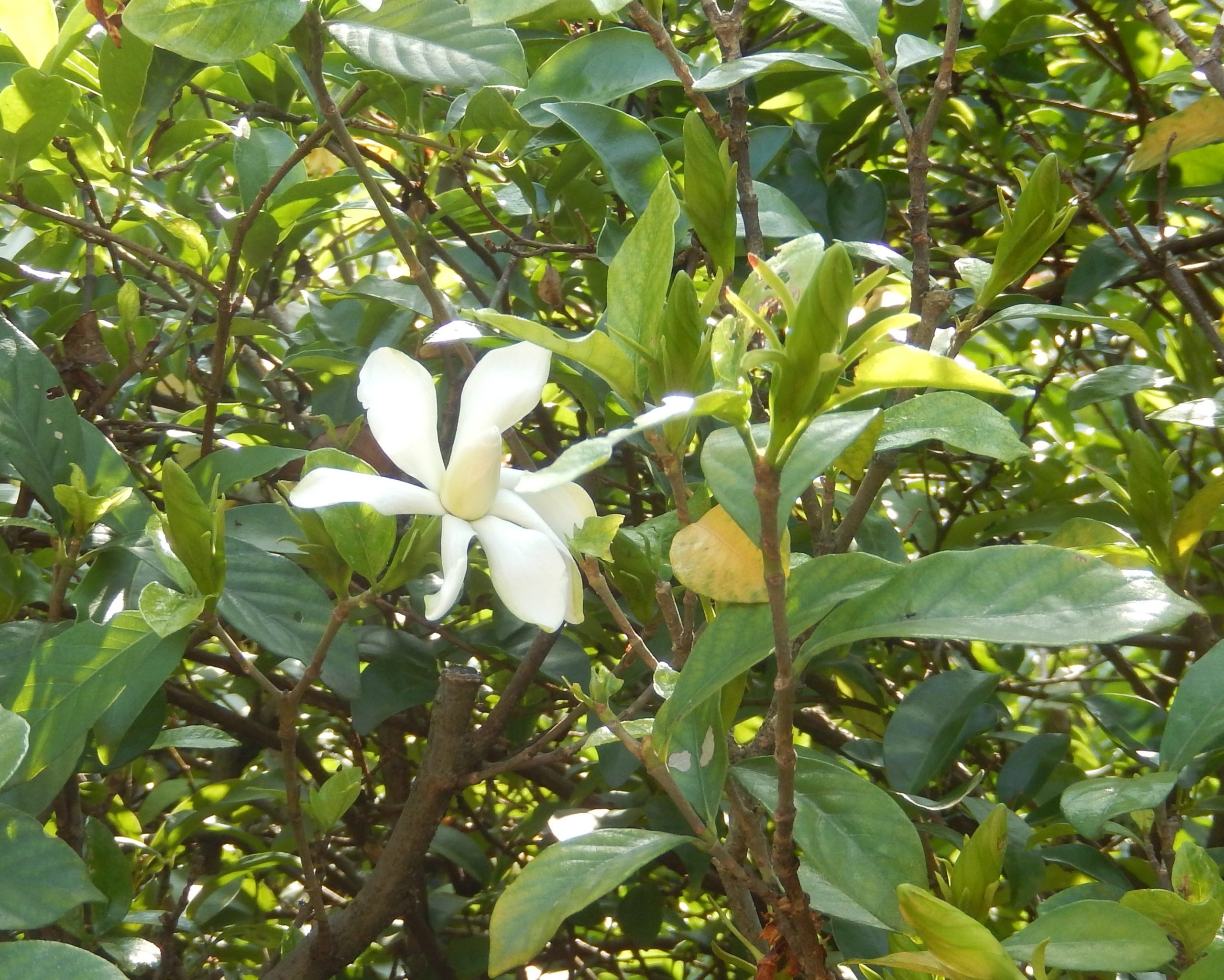 梔子的品種多,別名也多。我到花市閒逛,看到我熟知的梔子花都被標示為「玉堂春」。花店老闆說:「台灣原生的品種叫做山黃梔,多為單瓣,玉堂春為重瓣品種,花形大,但不結果,僅為觀賞用,可用扦插法繁殖。」